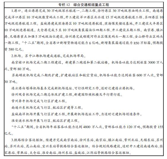 綜合交通樞紐銜接順暢。重點突出南京、連雲港、徐州三大國家級樞紐建設,把南京打造為麵向亞太、輻射中西部的長江三角洲重要門戶;充分發揮連雲港新亞歐大陸橋東橋頭堡功能,建成全國綜合運輸體係的海港樞紐;進一步發揮徐州溝通南北的門戶作用,強化其國家鐵路樞紐和主要內河港口地位。基本形成分工協作、功能完善的沿海、沿江港口群,全省港口年通過能力由“十一五”時期末的14億噸提升至20億噸,其中,集裝箱年通過能力由1154萬標箱提升至2000萬標箱;連雲港港、太倉港兩大集裝箱幹線港吞吐量分別由387萬、221萬標箱大幅提升至800萬、600萬標箱。鐵路綜合客運樞紐覆蓋省轄市和部分重要縣級城市。機場年旅客吞吐能力由2880萬人次增加到4800萬人次、貨郵吞吐能力由40萬噸增加到120萬噸,航空運輸服務範圍覆蓋省內全部縣級市和10萬人口以上城鎮,實現1.5小時車程內可享受到航空服務。在南京、無錫、淮安、南通和徐州建立5個快遞集散基地(園區),建設快遞處理中心(分撥中心)28處,增強快遞處理和運輸能力。
