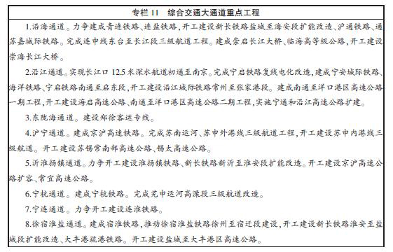 構建沿海通道。充分發揮沿海土地、岸線和區位優勢,加快完善交通基礎設施建設,積極推進沿海地區產業帶成長、城鎮帶發育,促進蘇中、蘇北跨越發展。重點打造沿海港口、水路和鐵路運輸,完善公路運輸,建成適應沿海地區北煤南運、北糧南運以及原油等重要物資運輸,連接環渤海地區與長江三角洲的運輸大通道。利用港口資源豐富的優勢,加快推進以連雲港港為核心、鹽城港和南通港為支撐的沿海港口群建設,加強與我國近、遠洋運輸網絡的連接,壯大港口實力,增強輻射帶動能力。加快大能力沿海鐵路通道建設。以完善連雲港港疏港係統為重點,加快提升連申線、鹽河等航道等級,加快建成臨海高等級公路,加強與重點港區相連的鐵路支線建設。“十二五”期間,通道內新增鐵路裏程284公裏,新增三級以上航道達標裏程139公裏,新改建臨海一級公路488公裏,新增高速公路31公裏,預期投資450億元。到2015年,通道江北段客運能力達到1.6億人/年、貨運能力達到2億噸/年,比“十一五”時期末分別提升47%和50%;通道江南段客運能力達到2.3億人/年、貨運能力達到2.3億噸/年,比“十一五”時期末分別提升21%和36%。