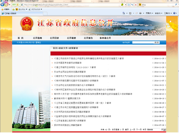 4.信息公開查閱場所。各地普遍在圖書館、檔案館、政務服務中心、辦事大廳設置政府信息公開查閱點,並配備設施、設備,為公民、法人和其他組織獲取政府信息提供便利。我省製定出台《关键词1省主動公開政府信息移送管理辦法》,將政府信息移送工作納入各單位信息公開日常工作,對移送的時間、範圍作出明確要求,並作為信息公開考核的重要內容。各地進一步加強信息公開查閱場所建設,泰州市開展了政府信息公開查閱點標準化建設,統一管理製度、硬件設施、場所標識,開展規範化服務。截至2014年底,全省共設置政府信息公開查閱點2599個。