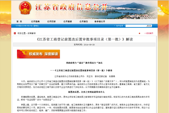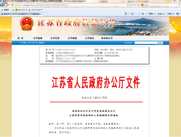 2014年,省政府辦公廳收到政府信息公開申請436件,比上年增長52%,所有政府信息公開申請均按規定進行答複,按時答複率為100%。根據申請方式來看:網絡申請196件,信函申請240件。根據答複情況來看:屬於已主動公開範圍的134件,同意公開的31件,同意部分公開的0件,不同意公開的9件,不屬於本機關公開的122件,申請信息不存在的105件,告知作出更改補充的9件,告知通過其他途徑辦理的26件。根據申請內容涉及的地區來看,南京62件,無錫45件,徐州16件,常州32件,蘇州41件,南通78件,連雲港3件,淮安9件,鹽城24件,揚州8件,鎮江16件,泰州18件,宿遷6件;排在前5位的依次是:南通、南京、無錫、蘇州、常州。