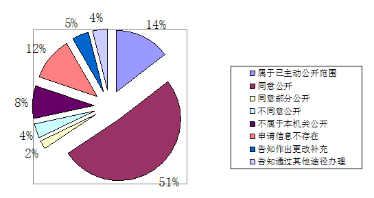根據答複情況來看:屬於已主動公開範圍的4749件,同意公開的16711件,同意部分公開的748件,不同意公開的1295件,不屬於本機關公開的2760件,申請信息不存在的3784件,告知作出更改補充的1482件,告知通過其他途徑辦理的1233件。