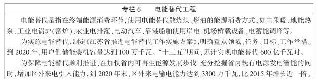 積極推動電能替代。以提高電能占終端能源消費比重、提高電煤占煤炭消費比重、提高可再生能源占電力消費比重、降低大氣汙染物排放為目標,結合不同電能替代方式技術經濟特點,製定電能替代實施方案,因地製宜、突出重點,逐步擴大電能替代範圍,形成清潔、安全、智能的新型能源消費方式。工業領域,以金屬冶煉、玻璃製造、服裝印染、木材加工等用熱行業為重點,加快推廣蓄熱式和直熱式工業電鍋爐、電驅式皮帶運輸和電驅動吊機,推進“以電代煤”“以電代油”,直接壓減煤炭和燃油需求。交通領域,打造綠色交通體係,加快發展船舶岸電係統和推廣電驅動、氣驅動裝卸技術應用,建設空港陸電和場內車輛“油改電”示範工程,大力實施電動汽車充電設施建設行動。建築領域,對熱力管網覆蓋範圍之外的醫院、學校、商場、辦公樓等公共建築,加快推廣蓄熱式電鍋爐、熱泵和電蓄冷技術,鼓勵建設地源(水源、汙水源)熱泵供熱(製冷)等可再生能源建築應用係統。農業領域,重點推廣糧食電烘幹、農業溫室大棚熱泵和電熱膜、禽類繁殖電暖孵化、電製茶等技術。居民生活領域,重點推廣碳晶采暖等高效電采暖技術和熱泵熱水器、熱泵輔助加熱、電輔助太陽能熱水器適用技術;在城市居民小區試點蓄熱電鍋爐、熱泵技術,推進新型集中供熱,推廣燃氣分戶采暖應用。到2020年,電力消費(按供電標煤計算)占全社會能源消費總量55%左右。