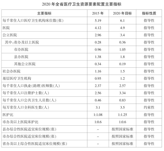 1.到2020年,每千常住人口醫院床位數達到4.9張,其中公立醫院床位數3.4張(省辦醫院0.36張,市辦醫院1.05張,縣辦醫院1.8張,其他公立醫院0.19張),全省按照每千常住人口不低於1.5張為社會辦醫院預留規劃空間。