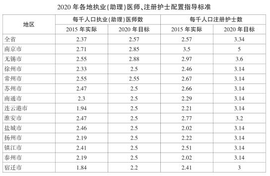 到2020年,全省每千常住人口執業(助理)醫師數達到2.57人以上,注冊護士數達到3.34人以上,醫護比達到1∶1.25以上,市辦及以上醫院床護比不低於1∶0.6。全省每萬常住人口全科醫生數達到3.5人,每千常住人口公共衛生人員數達到0.83人。各地根據實際合理配置並適當調整衛生人力資源規模。