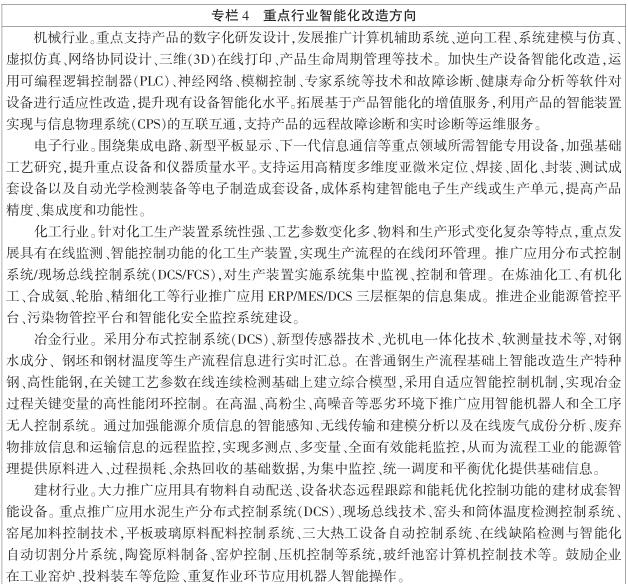 (六)著力支持重點行業智能轉型。圍繞製造業重點行業和領域推進智能產品設計、智能裝備應用、智能產品生產、智能服務,培育和推廣離散型、流程型、網絡協同製造、大規模個性化定製、遠程運維服務等智能製造新模式。