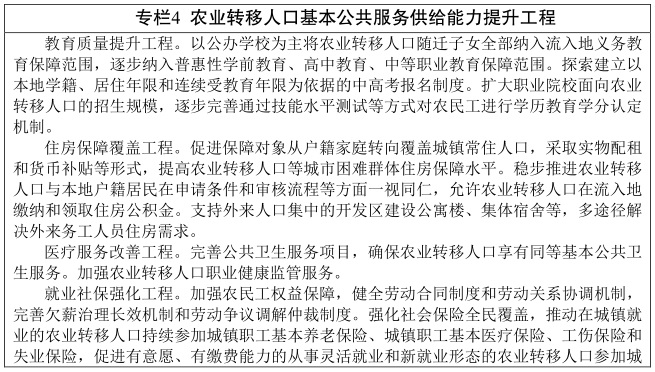保障農業轉移人口享有均等基本公共服務。以子女教育、住房保障、社會保險、醫療衛生等為重點,持續推進基本公共服務常住人口均等化全覆蓋,切實提高農業轉移人口各類服務保障實際享有水平。推動農業轉移人口隨遷子女入學待遇和升學考試同城化,著力提升隨遷子女與本地學生教育融合度。完善以公租房、保障性租賃住房和共有產權房為主體的住房保障體係,加大農業轉移人口住房保障力度,優先滿足舉家遷徙農業轉移人口的住房需求。強化用人單位社會責任,依法為農業轉移人口繳納社會保險,穩步提高城鎮職工基本養老保險參保繳費率和基本醫療保險參保率。依托用工單位和居住社區,發揮工會、婦聯、共青團及社會組織作用,加強對農業轉移人口幫扶關懷,鼓勵積極參加社區活動,盡快融入城市生活。
