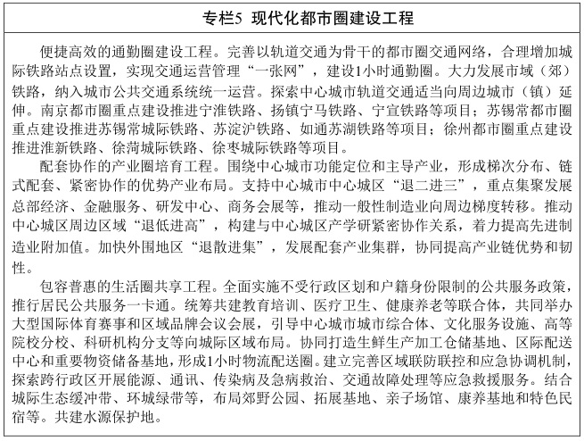 建設南京都市圈跨區域現代化都市圈典範。發揮南京龍頭帶動作用,優化創新名城路徑,彰顯魅力古都特色,增強區域性創新服務和公共服務功能,帶動都市圈整體能級和國際競爭力提升,成為長三角強勁活躍增長極的有力支撐。探索構建南京特大城市與大中小城市優勢互補、協同發展的體製機製,推動基礎設施互聯互通、科創產業深度融合、投融資協同、生態環境共保共治、公共服務普惠共享,著力在同城化建設水平上走在前列。集成整合重大基礎設施、高端開放平台和一流營商環境,協同打造全球產業技術創新網絡的重要節點和高新技術產業培育策源地,在雙向開放合作中提升服務長江經濟帶發展能力。