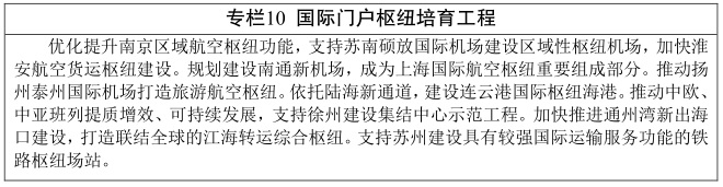 完善樞紐城市布局。立足城市區位特征、資源稟賦和發展定位,打造高效集成、聯動支撐、功能各異的多層次樞紐城市群空間布局。積極建設南京國際樞紐城市,加快空港、海港和高鐵港聯動發展,完善宜居、宜創、宜業、宜遊功能,塑造包容開放的人文精神,著力構建各類資源要素的集聚點和交匯地,全麵擴大國際交往與國際服務,推動揚州、鎮江融入南京樞紐布局。加快蘇州、無錫與南通共建全國性綜合交通樞紐城市群,推進新型基礎設施布局建設與全域應用,強化跨江城際快速交通聯係,協同打造江海組合強港,積極發展創新經濟、臨空經濟和供應鏈物流,支持與上海共建國際性綜合交通樞紐。建設徐州—連雲港—淮安國家綜合性物流樞紐,支持宿遷融入建設,培育提升雙向開放能力,帶動特色產業發展和高端人才集聚。引導常州、泰州和鹽城有針對性地建設基礎設施平台、產業創新平台和區域服務平台,增強要素集散功能。
