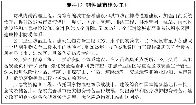 完善應急管理機製。健全應急預案體係,建立統一指揮、專常兼備、反應靈敏、上下聯動的應急管理體製。迭代升級突發事件預警信息發布平台,加強應急廣播等信息發布渠道建設和及時傳播。堅持地上地下空間相結合,合理規劃布局應急避難、災害避難等場所,改善體育場館等公共建築和設施的應急避難功能。構建24小時聯通的區域應急“綠色通道”。健全重要物資收儲、輪換、調撥機製和統計製度,統籌實物儲備和協議儲備,推進企業儲備和家庭儲備。加強綜合應急救援力量建設,支持有條件的企業建立專業化公益組織與誌願服務應急隊伍。深入開展防災減災知識宣傳和普及教育,健全防災減災演習機製,提高居民自救互救能力。