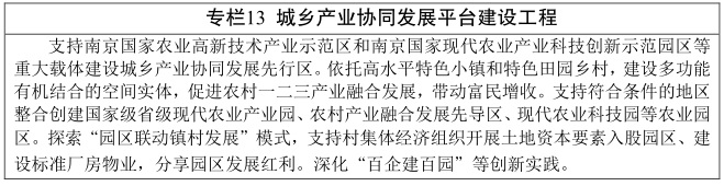 堅守耕地保護、農民權益和生態環境底線,因地製宜將鄉村打造成城市的地標產業鏈協同區、綠色農產品供給地、生態人文後花園,加快構建城鄉命運共同體。堅持把保障糧食和重要副食品有效供給作為首要任務,統籌耕地數量保護和質量提升。培育壯大鄉村優勢特色產業,發展生態農業、精品農業和科技農業,城鄉協同構建全程可追溯的綠色安全食品供應鏈。引入現代產業發展理念和組織方式,支持城鄉結對、村企掛鉤,鼓勵發展訂單農業、觀光農業、農業生產性服務業等新產業新業態,構建鄉村產業融合發展新體係。依托自然生態資源,積極發展文化旅遊、康養休閑、民宿經濟等綠色低碳產業,建設一批新經濟空間,推動生態資源產業化。建立鄉村文化保護利用機製,著力打造蘇派民居,創新傳統工藝振興模式,形成鎮村聯動的文旅特色產業品牌。實施“互聯網+”農產品出村進城工程,促進與城市市場高效銜接。規劃建設類型多樣、功能先進的城鄉產業協同發展平台,提升要素集聚、功能服務和產業承載能力。