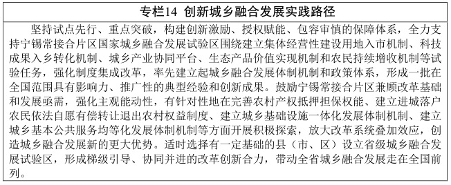 城鄉融合發展展開布局。鄉村振興戰略深入實施,城鄉融合發展體製機製和政策體係初步建立。農民增收步伐加快,城鄉居民收入比縮小到2.19:1。城鄉要素雙向自由流動製度性通道進一步拓寬,武進農村土地製度改革試點產生較大影響,“萬企聯萬村、共走振興路”行動紮實推進。城鄉基本公共服務製度加快接軌,鄉村學校建設條件和管理機製持續改善,統一的城鄉居民基本養老保險、基本醫療保險和大病保險製度基本建立。累計命名324個关键词1省特色田園鄉村,“新魚米之鄉”的時代風貌初步展現。寧錫常接合片區獲批國家首批城鄉融合發展試驗區,在建立生態產品價值實現機製、打造城鄉產業協同發展平台等方麵初步形成經驗做法。