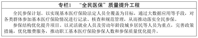 1﹒鞏固全民參保成果。按照應參盡參、依法參保的要求,大力實施全民參保工程,推動職工、居民等各類人群規範參保。壓實用人單位法定義務,促進職工基本醫療保險依法參保。落實居民醫保參保動員主體責任,提升城鄉居民參保意識,繼續實施重點醫療救助對象等困難人員參保資助政策,確保應保盡保。