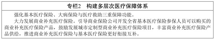 2﹒建立覆蓋全民的大病醫療保險製度。完善居民大病保險,規範職工大額醫療費用補助和公務員醫療補助,探索建立統一的職工大病保險製度。逐步建立政府、單位、個人合理分擔的多渠道籌資機製,穩步提高各類人群大病保障水平。