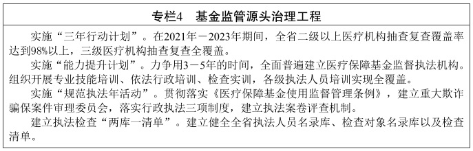 加快推進基金監管製度體係改革,織密紮牢保障醫保基金安全的防控機製,基本建成醫保基金監管製度體係和執法體係,形成全方位監管格局。