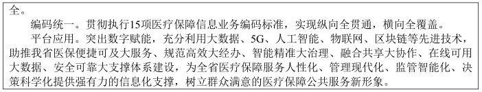 ——醫保信息化統一安全。全省統一的醫療保障信息平台建成使用,標準化智能化廣泛運用,全渠道、全業務、全流程醫保數字化治理體係基本形成,數據安全有效保障,醫保治理現代化支撐能力顯著提升。