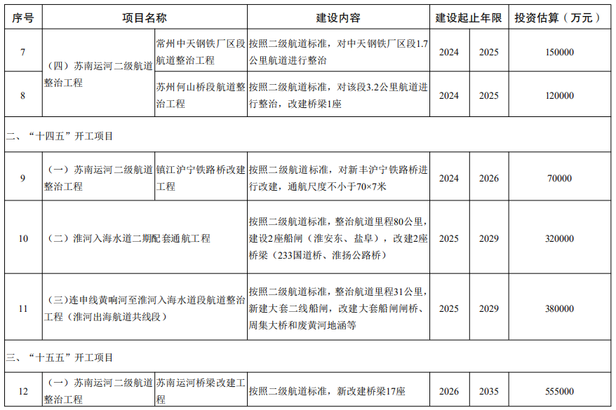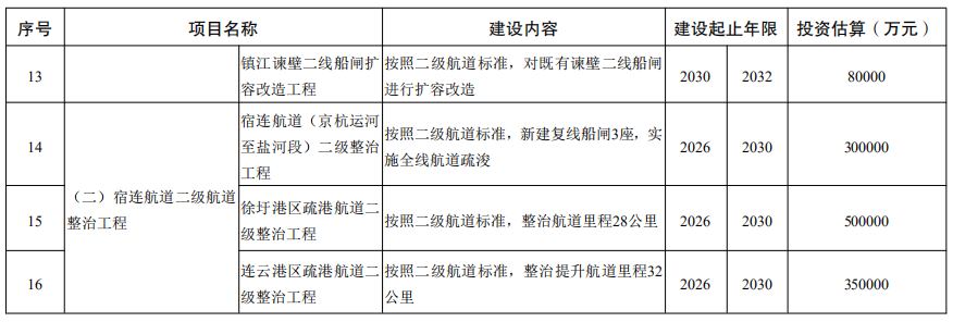 1﹒統籌推進二級航道網規劃建設。開展二級航道網規劃編製,在現有基礎上規劃新增蘇南運河、宿連航道、連申線(通榆運河、望虞河)等二級航道,規劃新增二級航道裏程1000公裏以上,全省二級航道總裏程超過2000公裏。到2025年,蘇南運河達到準二級,實現2000噸級船舶全天候暢行;宿連航道實現三級航道全線貫通、二級航道預留到位,連雲港港國際樞紐海港集疏運能力顯著提升。