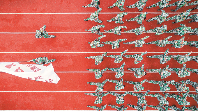 《氣勢磅礴》 吳疆/攝 2023年9月24日上午,南京三江學院舉行新生軍訓匯報表演。圖為無人機拍攝的會操分列式表演。