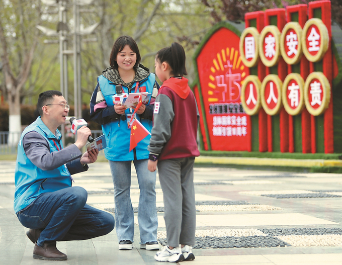 《對答如流》 鄭永波/攝 2024年4月13日,連雲港市集中開展全民國家安全教育宣傳活動,以喜聞樂見的方式宣傳國家安全的意義,增強群眾國家安全意識。圖為“行走的國旗課堂”誌願者與小朋友開展互動問答。