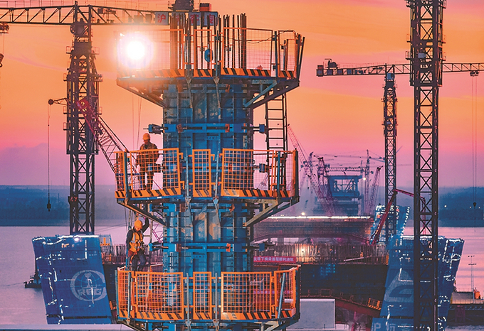 《挑燈夜戰》 張筠/攝 2024年11月9日晚,在建世界最大跨度雙塔雙索麵公鐵兩用無砟軌道斜拉橋——崇啟公鐵長江大橋施工現場,工人們挑燈夜戰保進度。