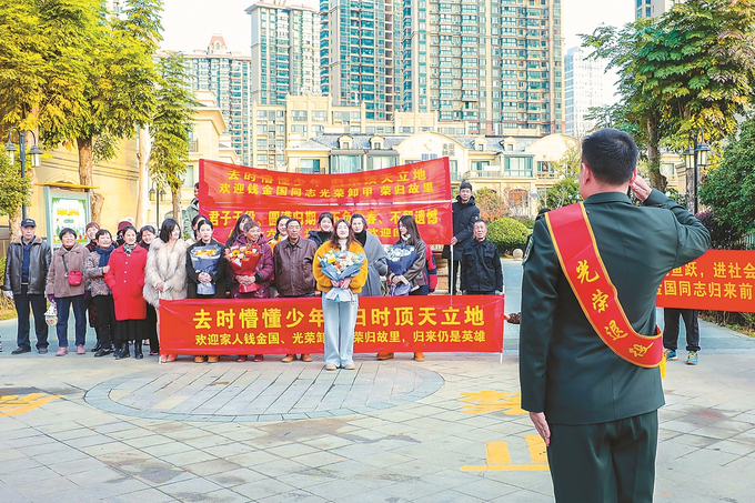 《榮歸》 潘海浪/攝 解放軍某部原副隊長、沭陽籍軍人錢金國,服役16年期間,榮立二等功一次,三等功兩次。圖為2024年12月3日,錢金國佩戴滿身軍功章回到家鄉,在小區門前受到親人和朋友的熱烈歡迎。